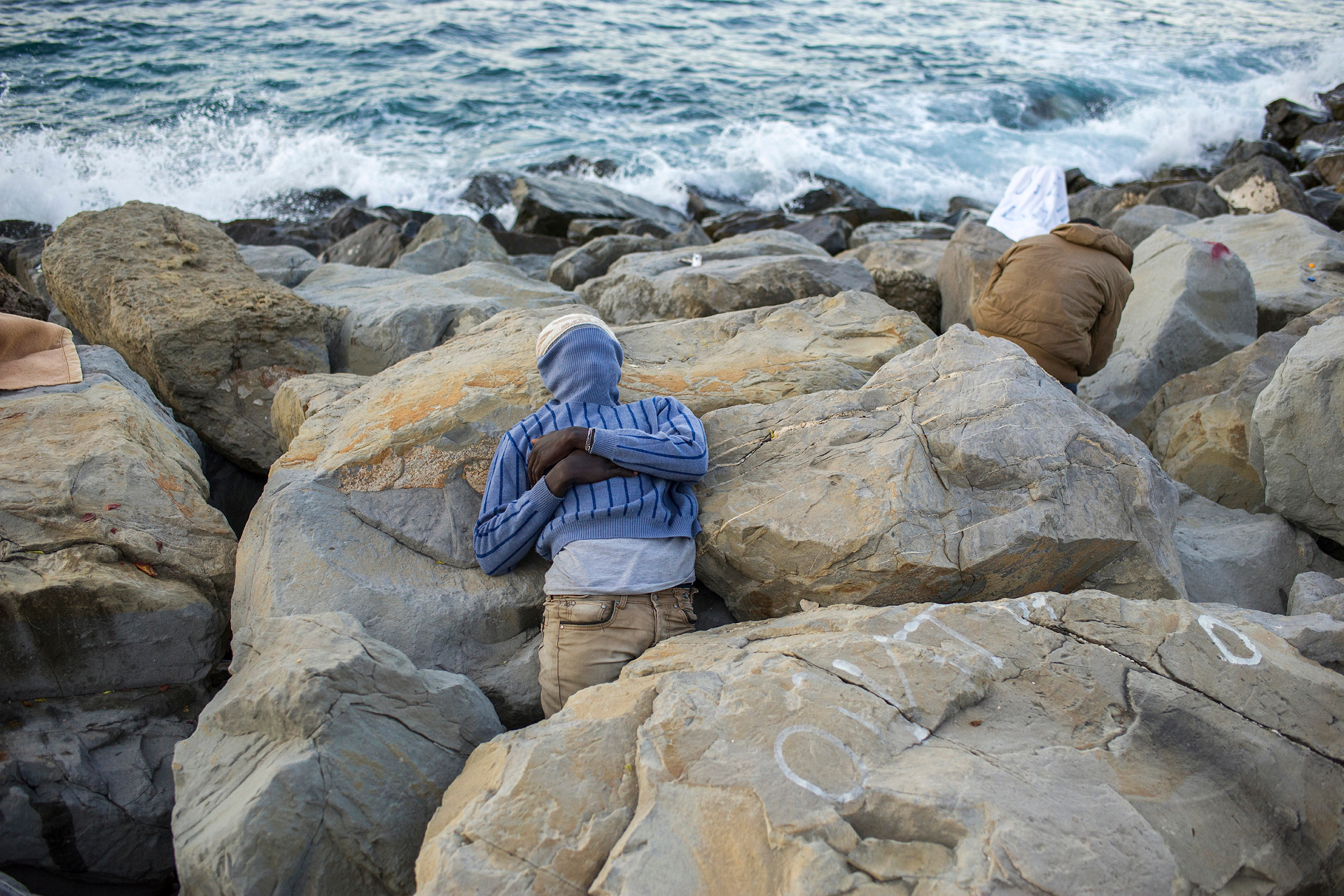 Snapshots on the border between Italy and France: a migrant finds shelter among rocks, in order to get some sleep.